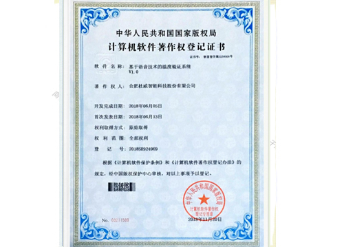 软件著作权证(基于语音技术的温度验证系统V1.0)