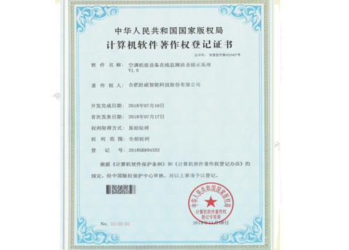 软件著作权证(空调机组设备在线监测语音提示系统V1.0)