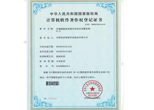软件著作权证(仓储温湿度监测在线语音报警系统V1.0)
