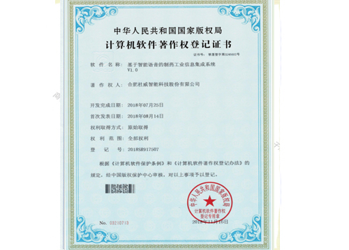 计算机软件著作权证(基于智能语音的制药工业信息集成系统V1.0)