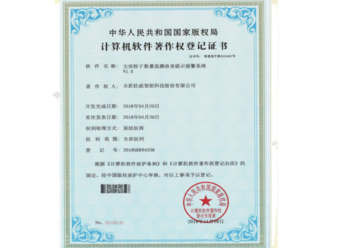 软件著作权证(尘埃粒子数量监测语音提示报警系统V1.0)