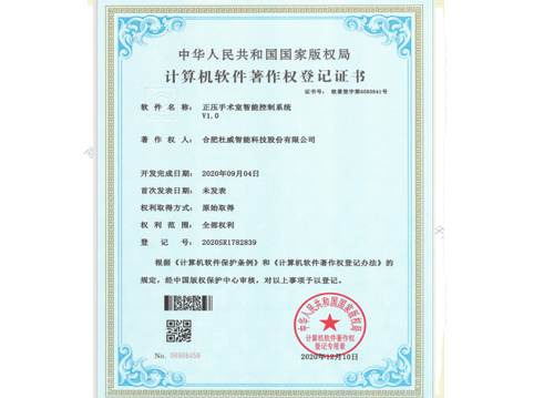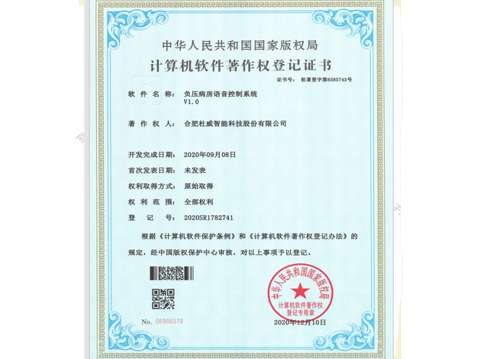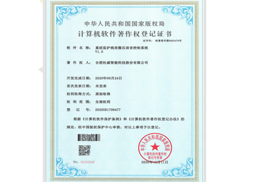 软件著作权证(重症监护病房微压语音控制系统V1.0)