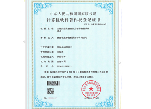 软件著作权证(生物安全实验室压力语音控制系统V1.0)