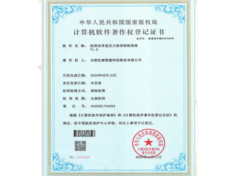 软件著作权证(医药洁净室压力语音控制系统V1.0)