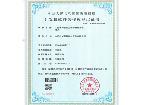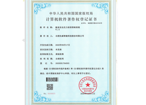 软件著作权证(舱室安全压力语音控制系统V1.0)